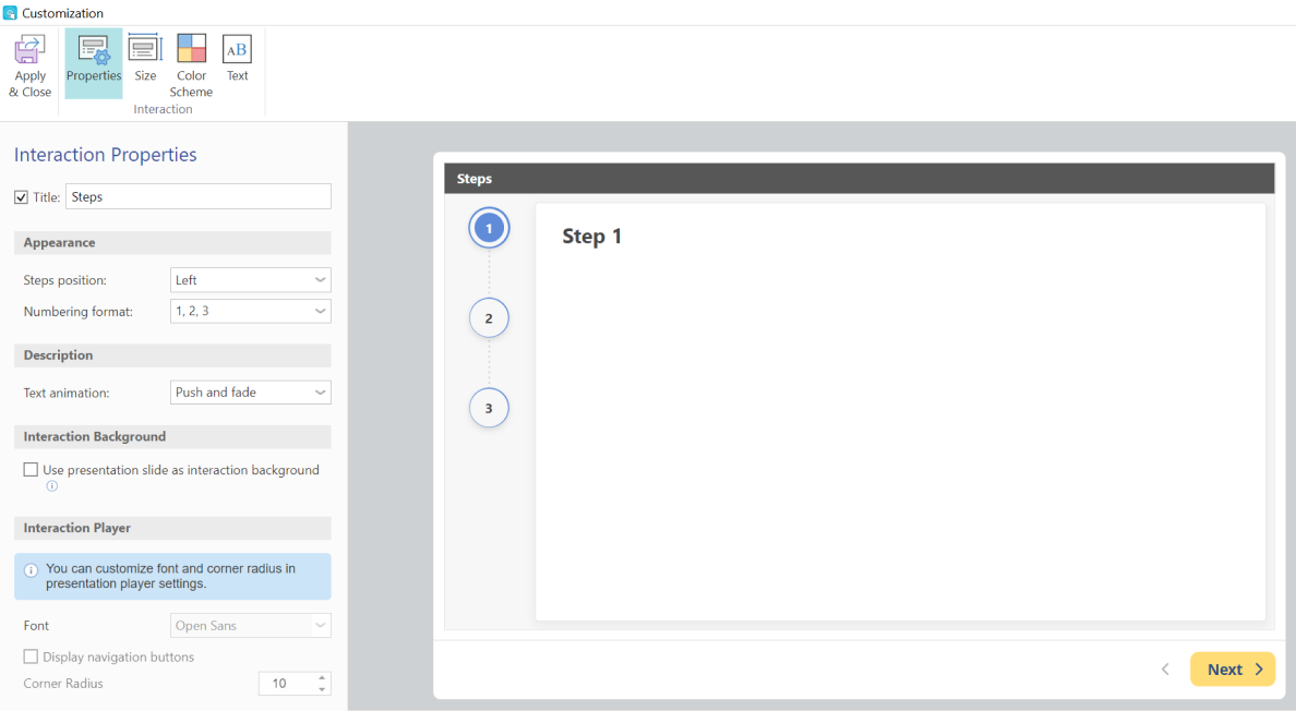 Compared to Adobe Captivate, interaction template settings can be limited. However, it is enough for many courses. For example, you can easily change basic appearance elements (colors, images, labels) and content within the interactions, but deeper interaction behaviors (like custom branching or advanced conditional triggers) aren’t available.