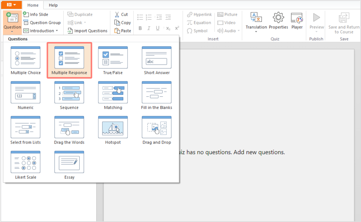 iSpring Suite’s QuizMaker has 14 pre-built question types, including multiple-choice, multiple response, drag-and-drop, short answer, matching, hotspot, Likert scale, and more.