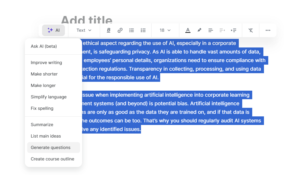 5. Paste your course text. Then, select the text to make a quiz based on it and click on “Ask AI.”