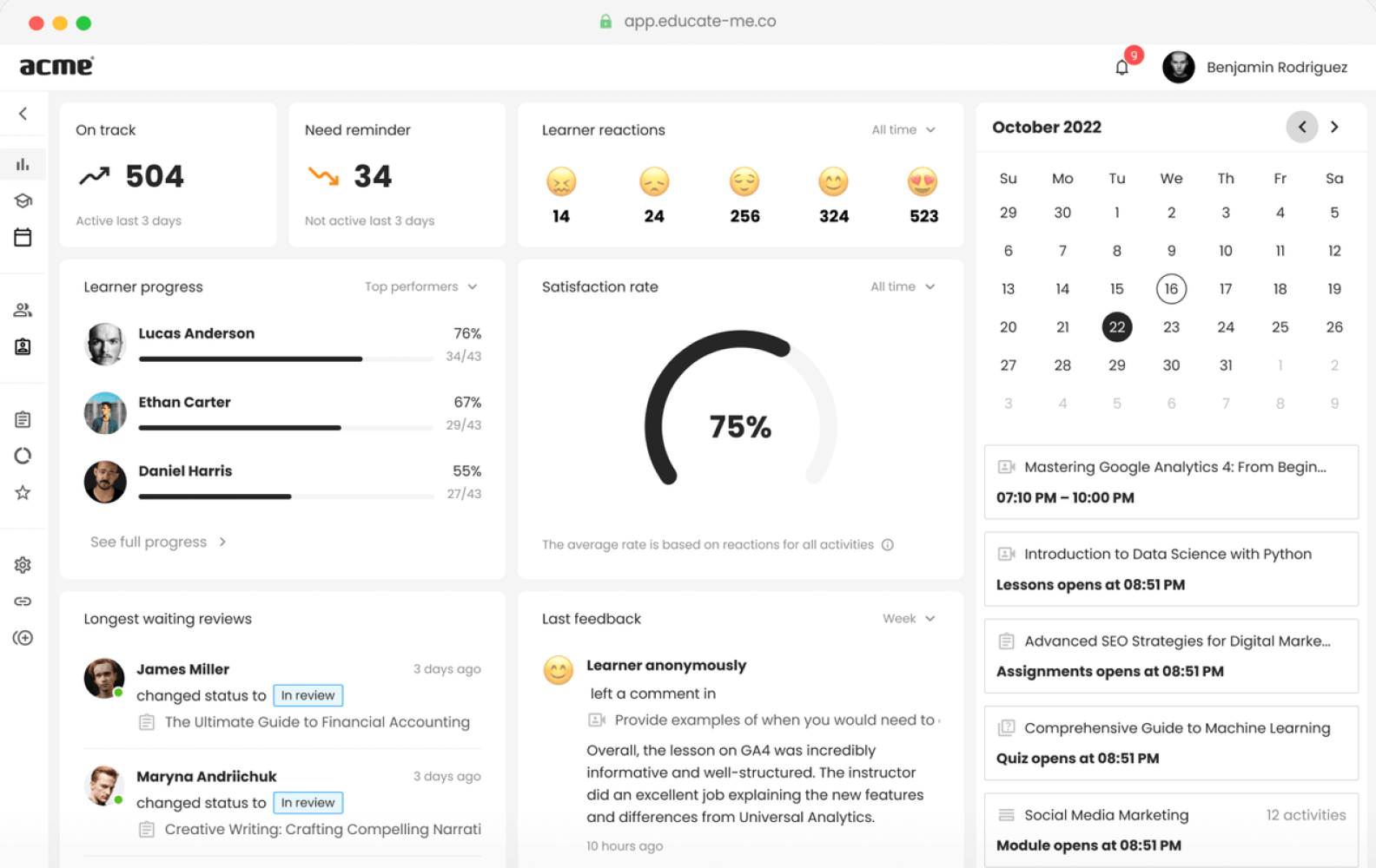 - Customizable dashboards. Enable instructors to track progress and manage courses with ease.