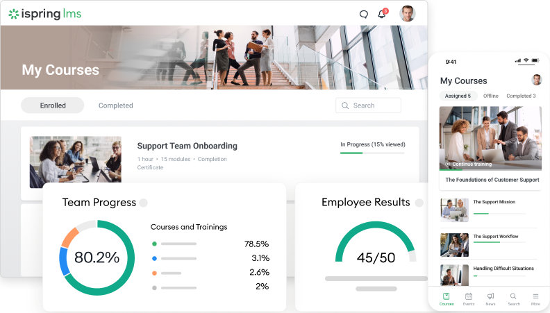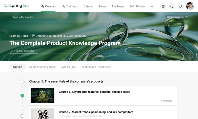 Learning tracks make this possible by turning goals into structured learning paths. iSpring LMS brings together courses, assessments, and resources into role-based programs that reflect how people actually grow into a position — not just how content is stored.