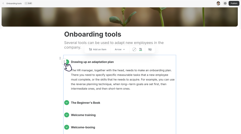 Now trainees can hide and reveal extra details in your courses, pages, and articles with a single click, thanks to Accordion Blocks. This design element helps you enhance content organization for pages, news, and Knowledge Base articles across all iSpring platforms.