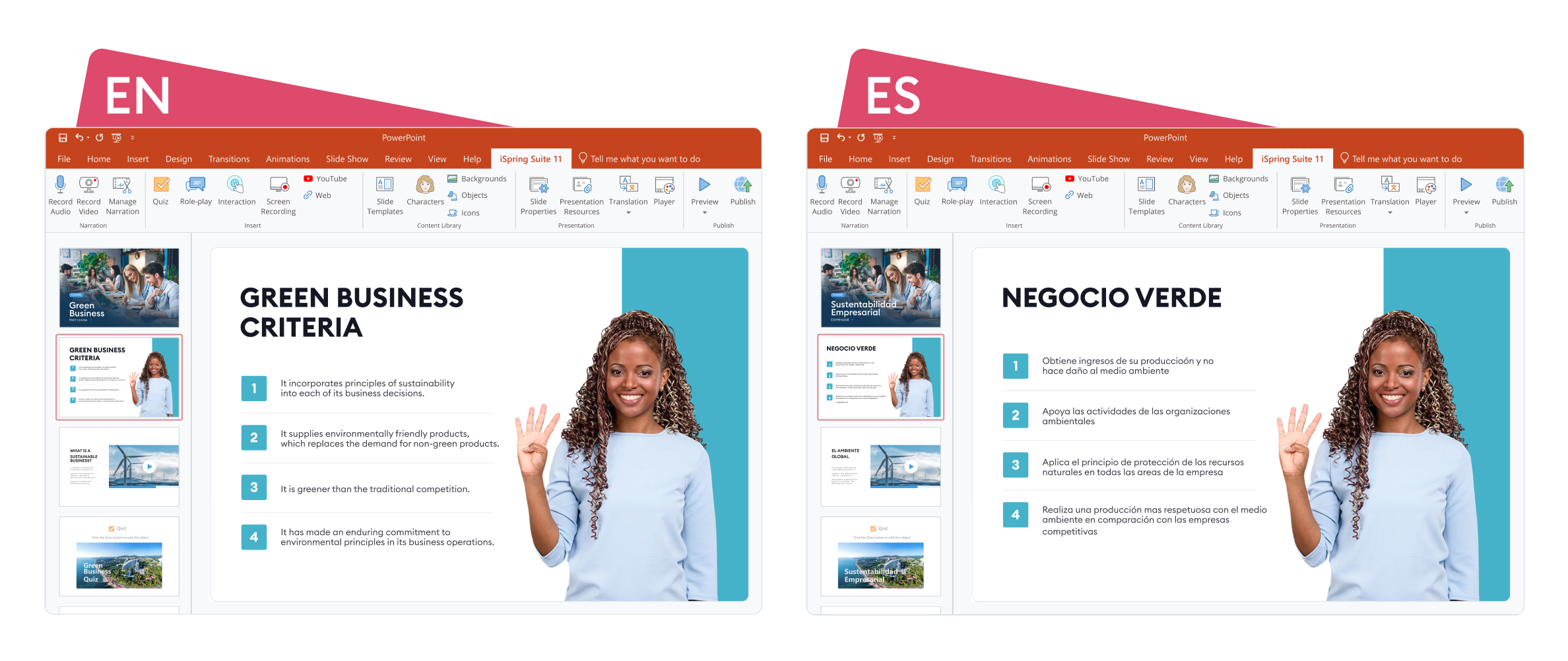 iSpring Suite now lets you translate courses into over 70 languages within minutes. AI handles the text while keeping your course structure intact. Just review the draft, make small adjustments if necessary, and your course is ready for a global audience.