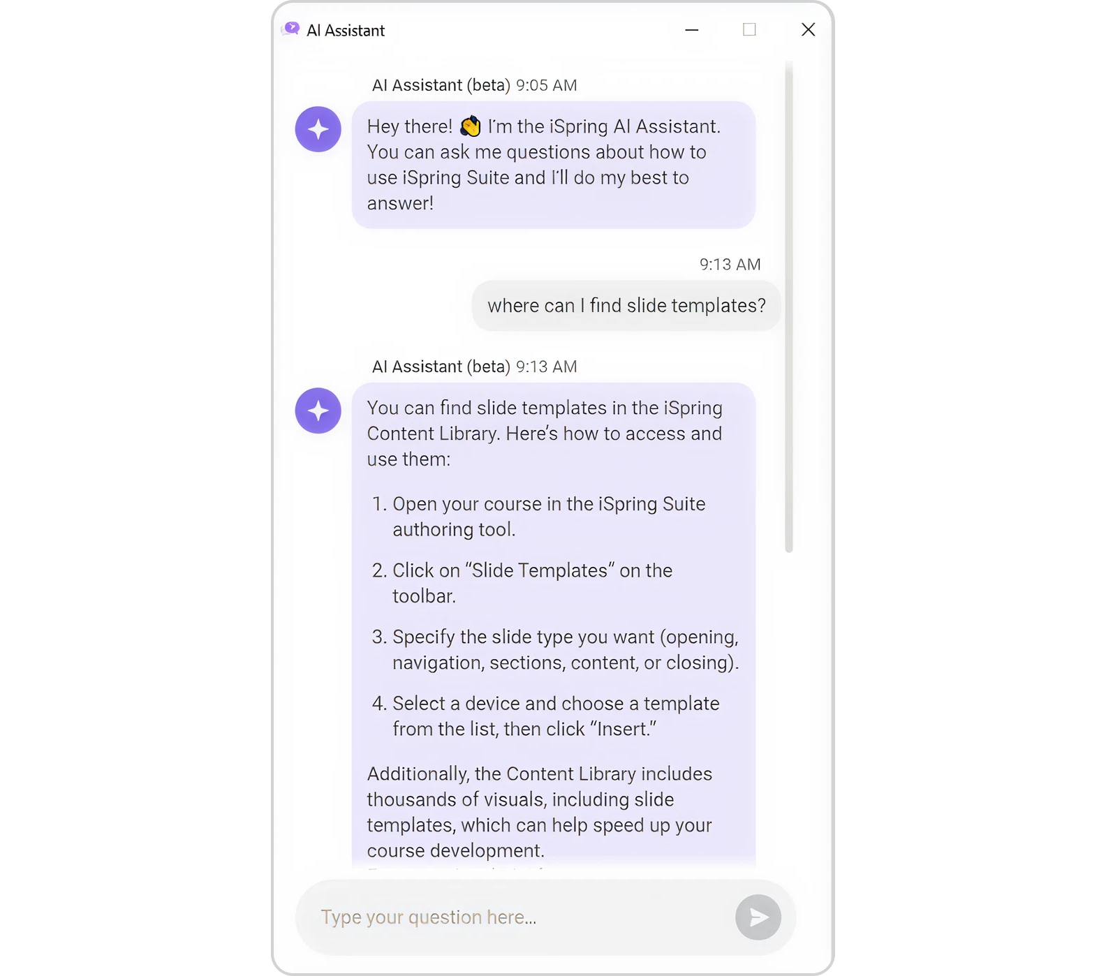 Have you ever been stuck on a technical question while building a course? Stop searching and start asking! The new AI Assistant is your built-in co-pilot, ready to deliver instant, step-by-step answers right inside iSpring Suite.