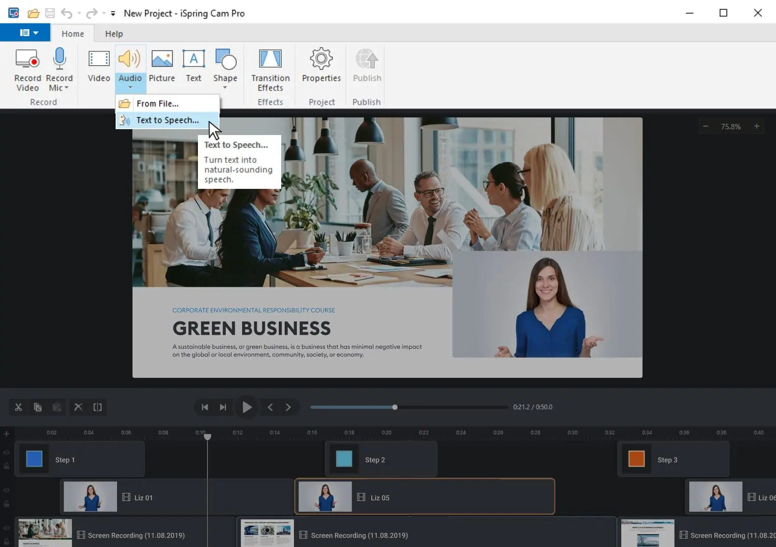 A new capability in iSpring Suite lets you convert text to speech and insert prerecorded audio directly into your video projects.