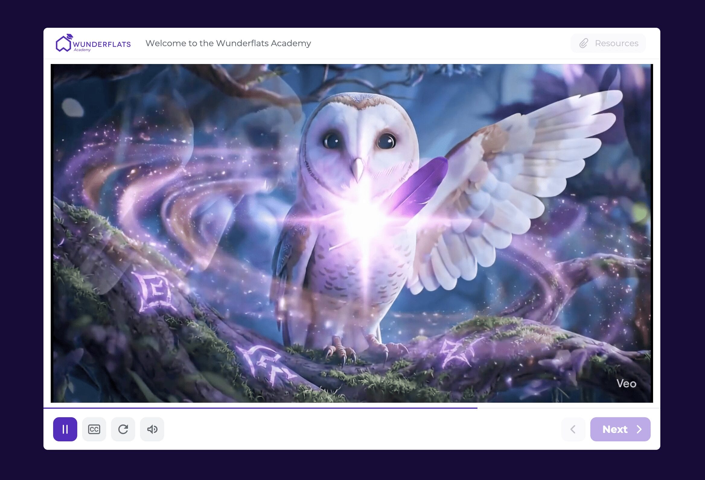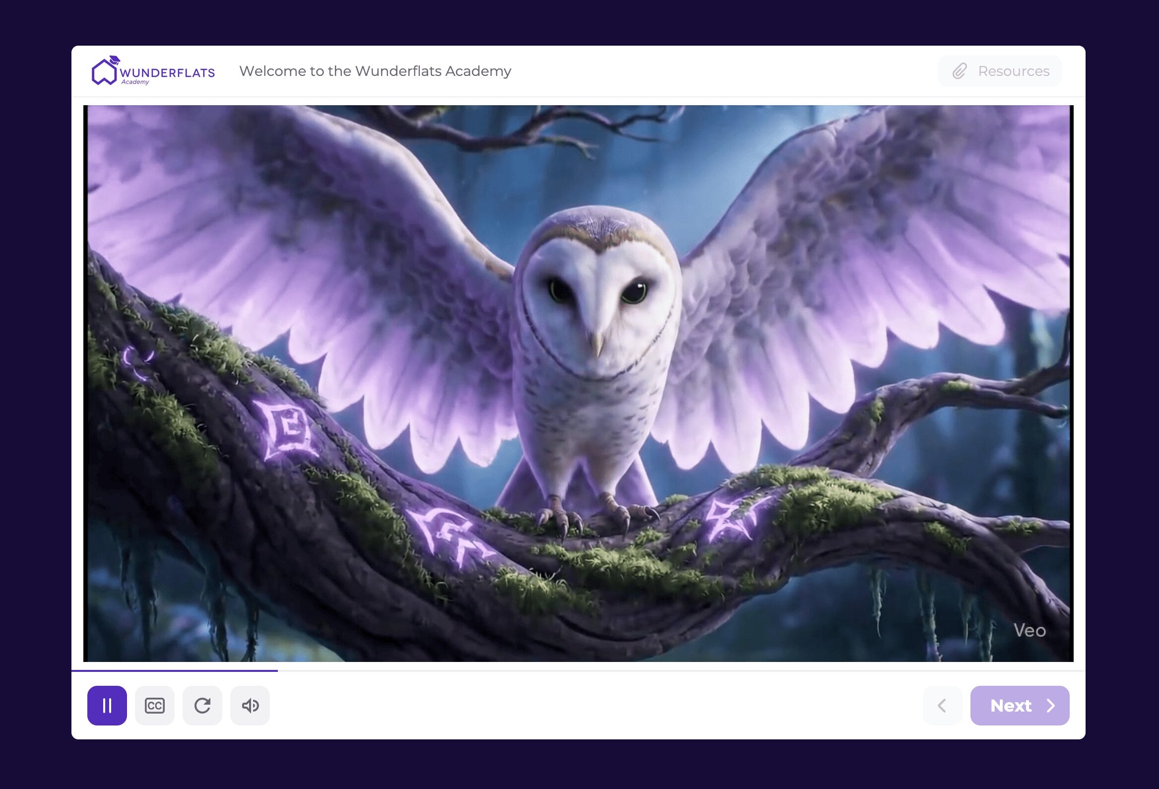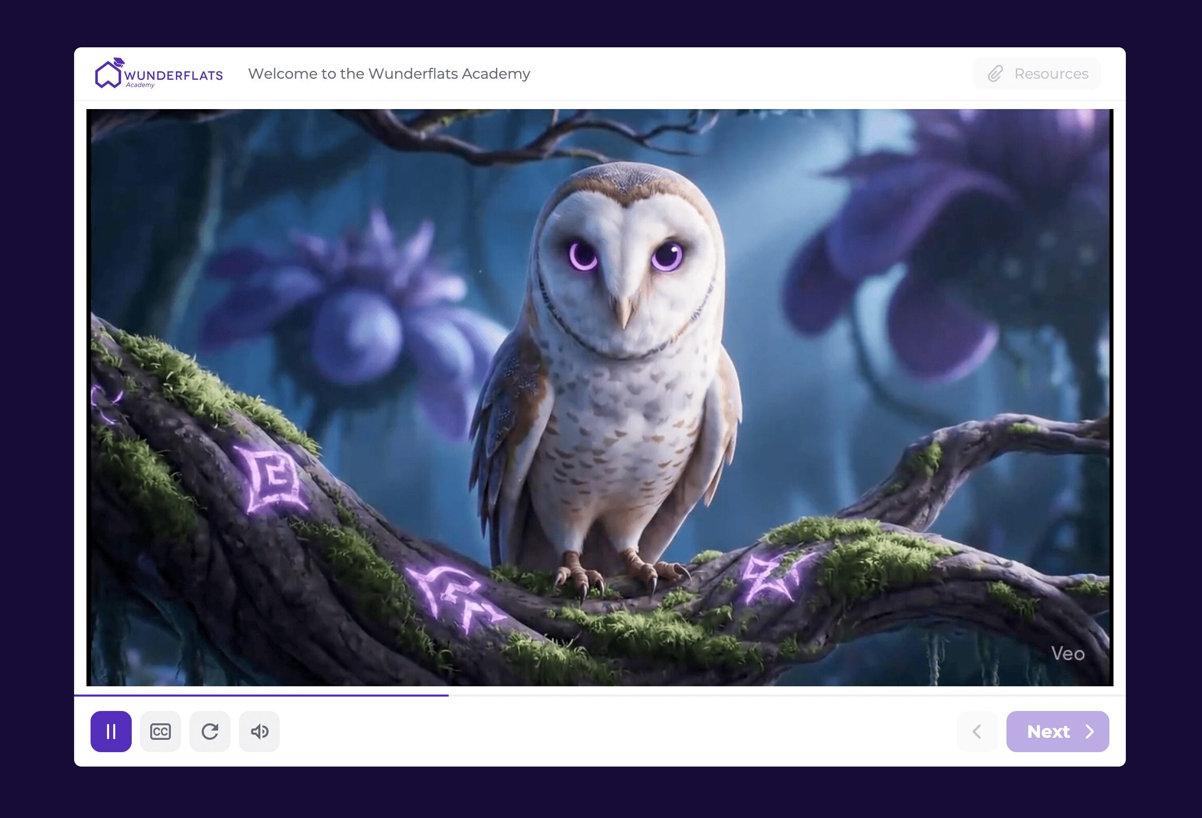 The real highlight, however, was the intro video. Using Google’s Veo 3, I created a fully animated, cinematic opening sequence that brought the owl character to life, complete with narration and music. It creates a true “goosebumps” moment that immediately immerses learners in the story from the very first second.