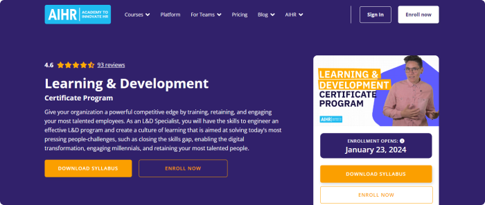 | 1. Learning & Development Certificate Program by AIHR | 23.5 hours – $975 for 1 certificate program |