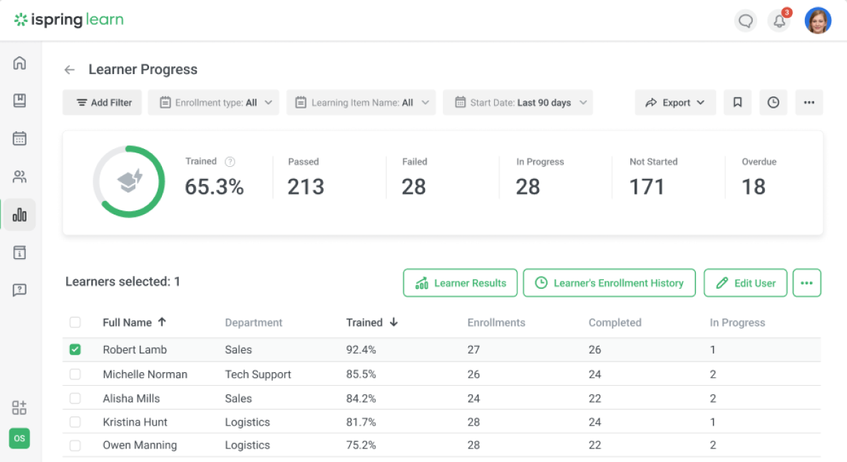 As mentioned earlier, reporting and advanced analytics tools in LMS systems provide educators with a variety of data and valuable insights that aid educators in honing their programs. Depending on the platform’s capabilities, these insights can appear in the form of a general overview or a detailed in-depth analysis focusing on a wide array of aspects.