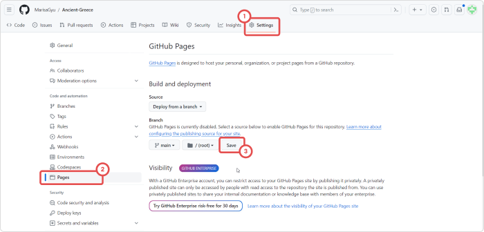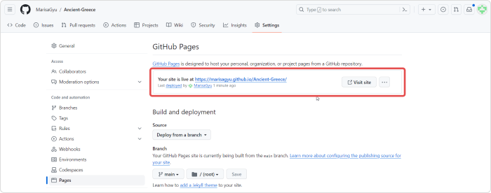 10. Go to the Settings tab and select Pages. You need to select Branch field -> main with the root folder. Click on Save.