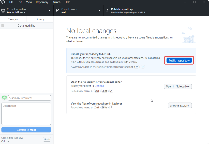 5. Return to GitHub Desktop. You’ll see the copied files on the left. You need to enter a summary and click on Commit to main.